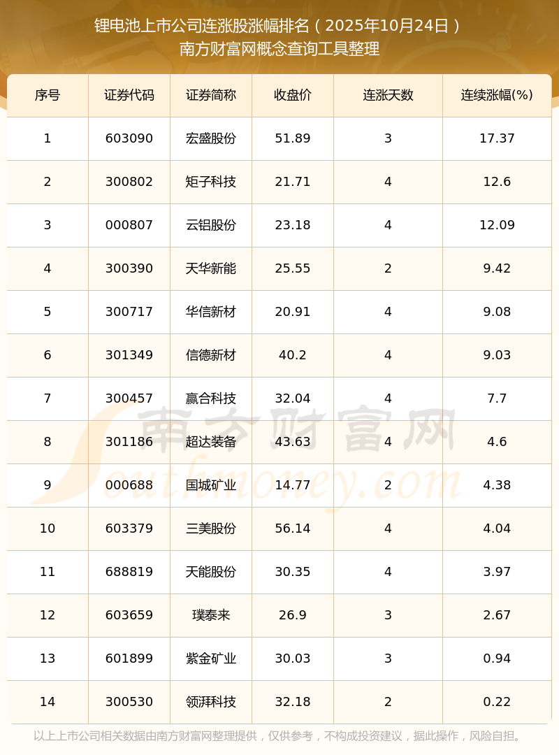 2025年10月24日鋰電池上市公司連漲股漲幅排名