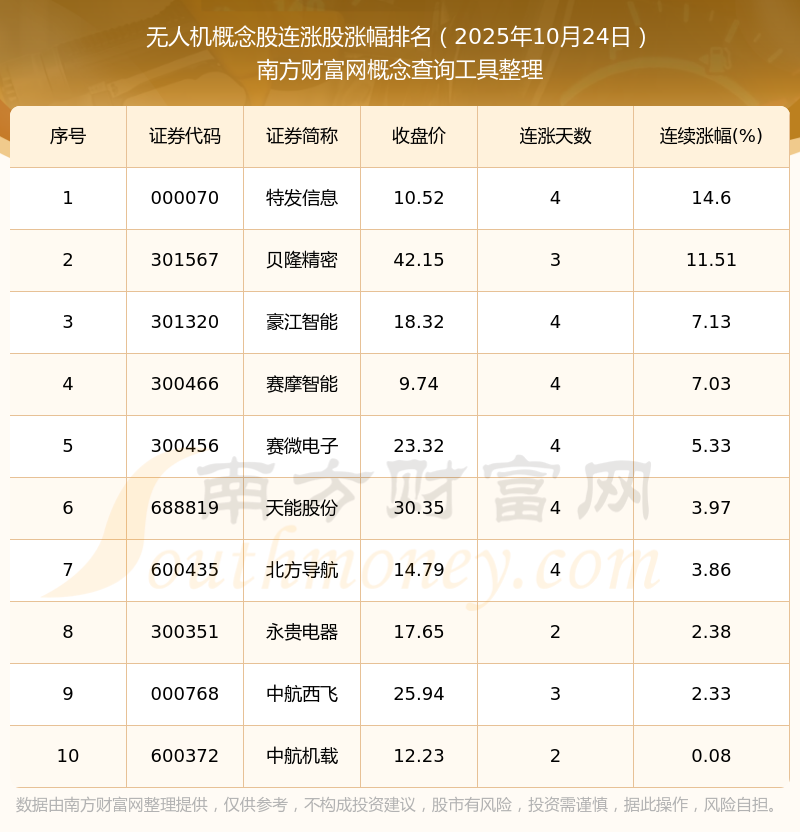 根據(jù)南方財富網(wǎng)概念查詢工具數(shù)據(jù)統(tǒng)計,截止2025年10月24日收盤,無人機概念股共有10只個股實現(xiàn)連漲。其中連續(xù)漲幅較大的個股有特發(fā)信息、貝隆精密、豪江智能等,連續(xù)漲幅分別為14.60%、11.51%、7.13%。