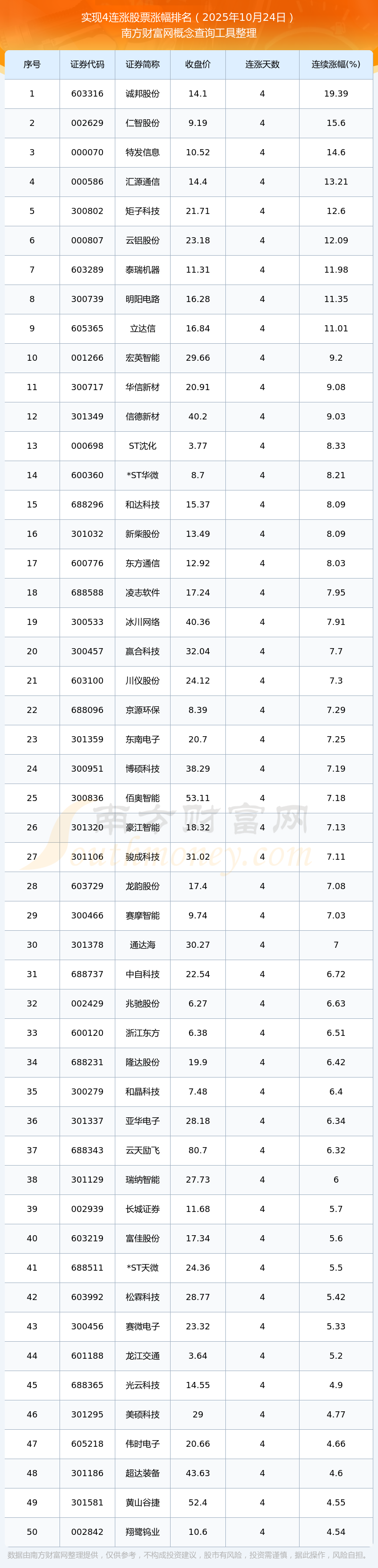 根據(jù)南方財富網(wǎng)概念查詢工具數(shù)據(jù)統(tǒng)計,截止2025年10月24日收盤,共有60只個股實現(xiàn)4天連漲。其中連續(xù)漲幅較大的個股有誠邦股份、仁智股份、特發(fā)信息等,連續(xù)漲幅分別為19.39%、15.60%、14.60%。 2025年10月24日實現(xiàn)4連漲股票漲幅排名 數(shù)據(jù)由南方財富網(wǎng)提供,