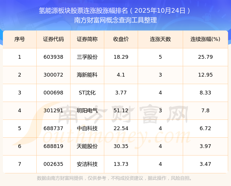 2025年10月24日氫能源板塊股票連漲股漲幅排名