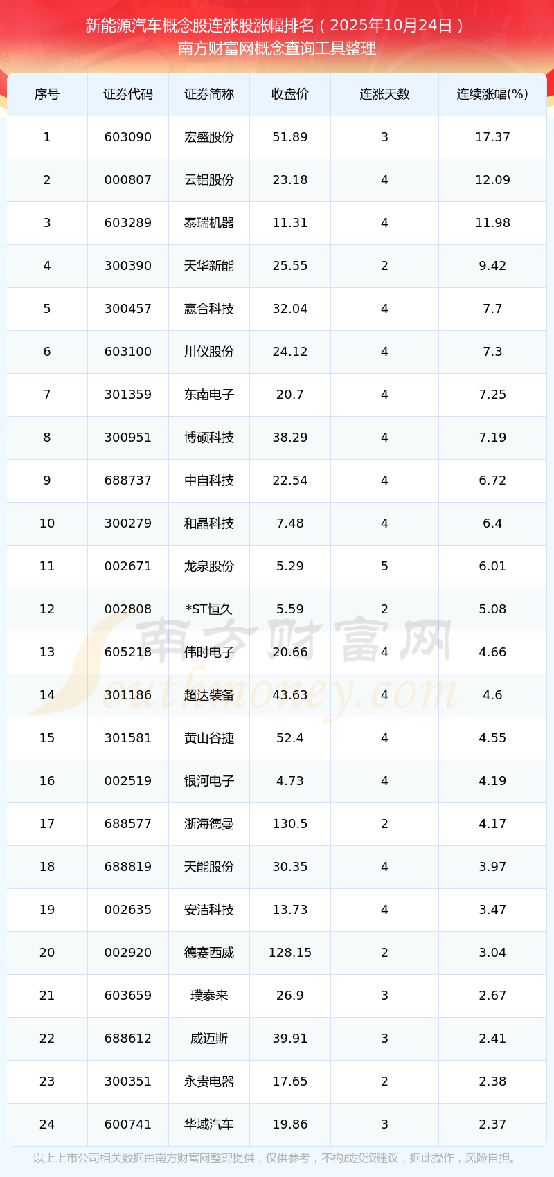 根據南方財富網概念查詢工具數據統(tǒng)計,截止2025年10月24日收盤,新能源汽車概念股共有24只個股實現連漲。其中連續(xù)漲幅較大的個股有宏盛股份、云鋁股份、泰瑞機器等,連續(xù)漲幅分別為17.37%、12.09%、11.98%。