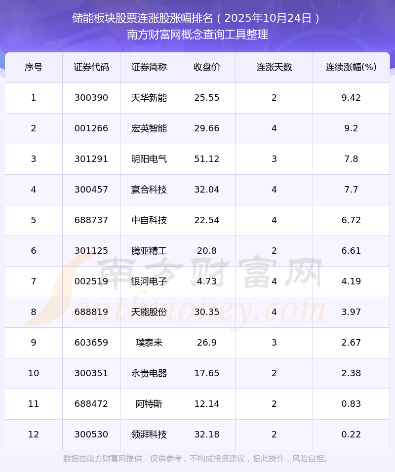 2025年10月24日儲能板塊股票連漲股漲幅排名