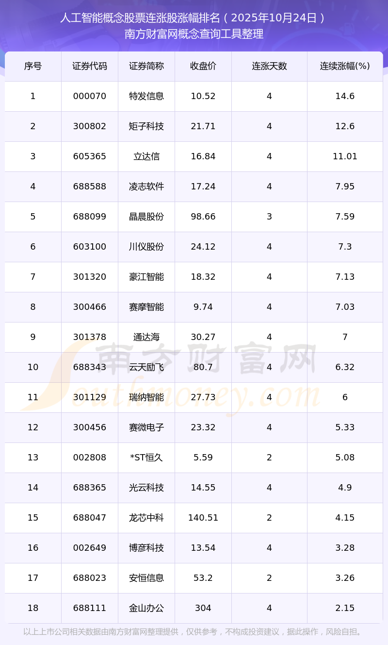 2025年10月24日人工智能概念股票連漲股漲幅排名