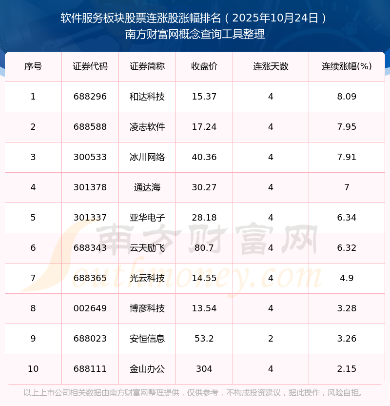 2025年10月24日軟件服務(wù)板塊股票連漲股票漲幅排名