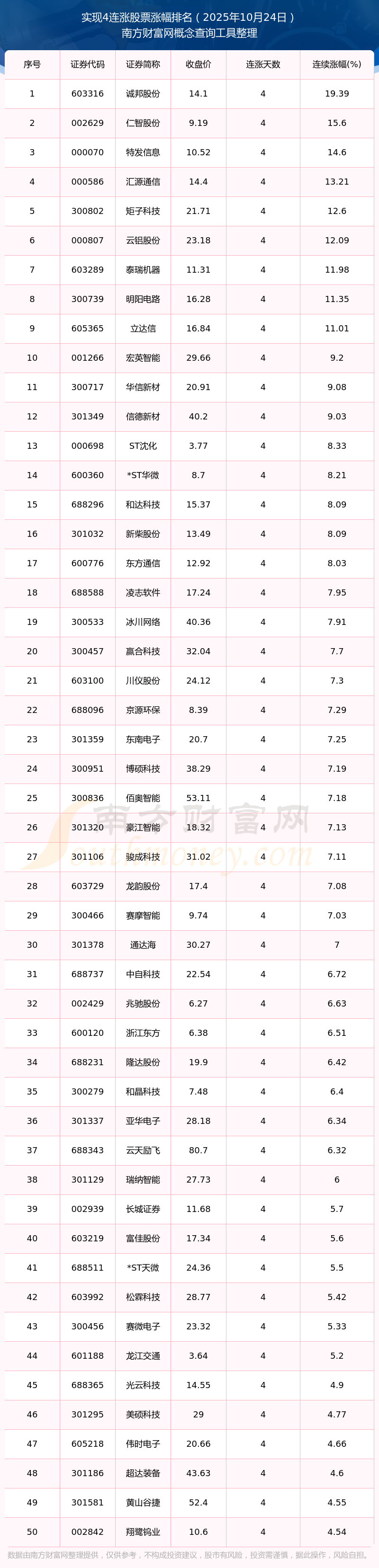 根據(jù)南方財(cái)富網(wǎng)概念查詢工具數(shù)據(jù)統(tǒng)計(jì),截止2025年10月24日收盤,共有60只個(gè)股實(shí)現(xiàn)4天連漲。其中連續(xù)漲幅較大的個(gè)股有誠(chéng)邦股份、仁智股份、特發(fā)信息等,連續(xù)漲幅分別為19.39%、15.60%、14.60%。 2025年10月24日實(shí)現(xiàn)4連漲股票漲幅排名 以上上市公司相關(guān)數(shù)據(jù)由