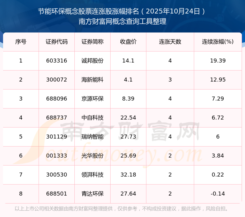 2025年10月24日節(jié)能環(huán)保概念股票連漲股漲幅排名