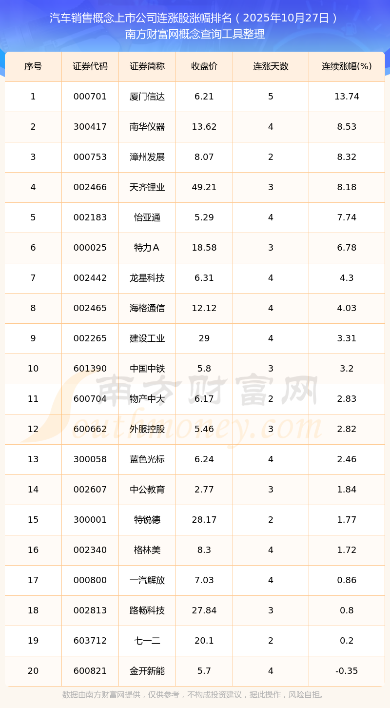 2025年10月27日汽車銷售概念上市公司連漲股漲幅排名