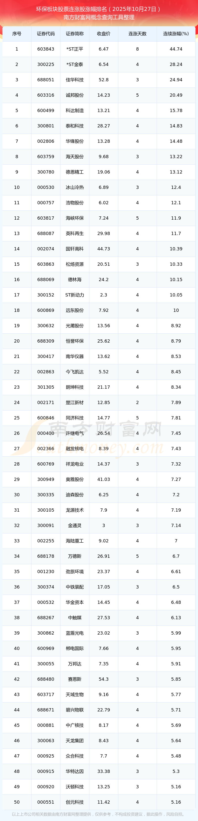 2025年10月27日環(huán)保板塊股票連漲股漲幅排名