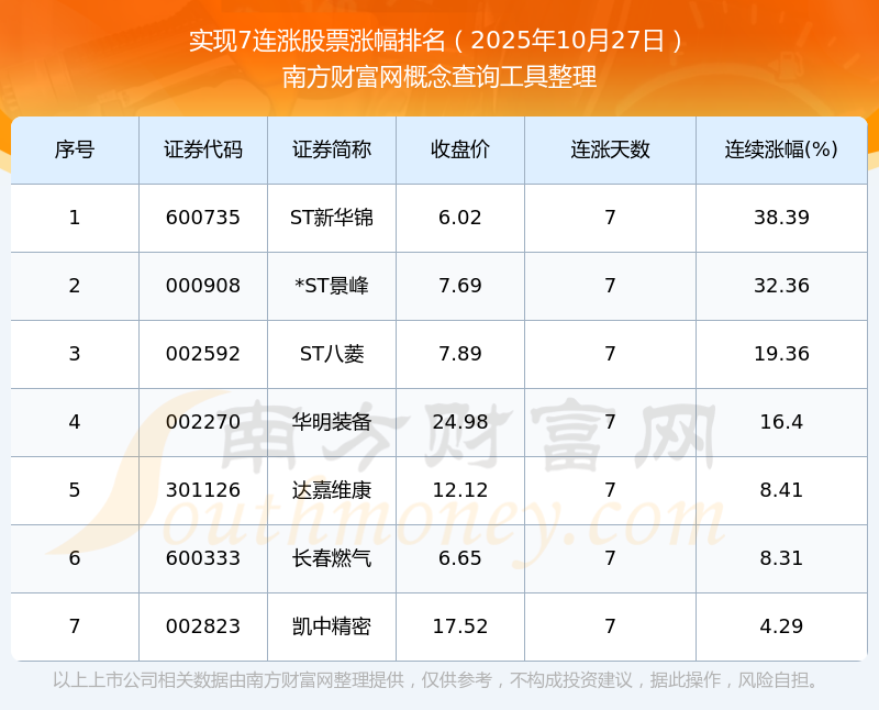 2025年10月27日實現(xiàn)7連漲股票漲幅排名