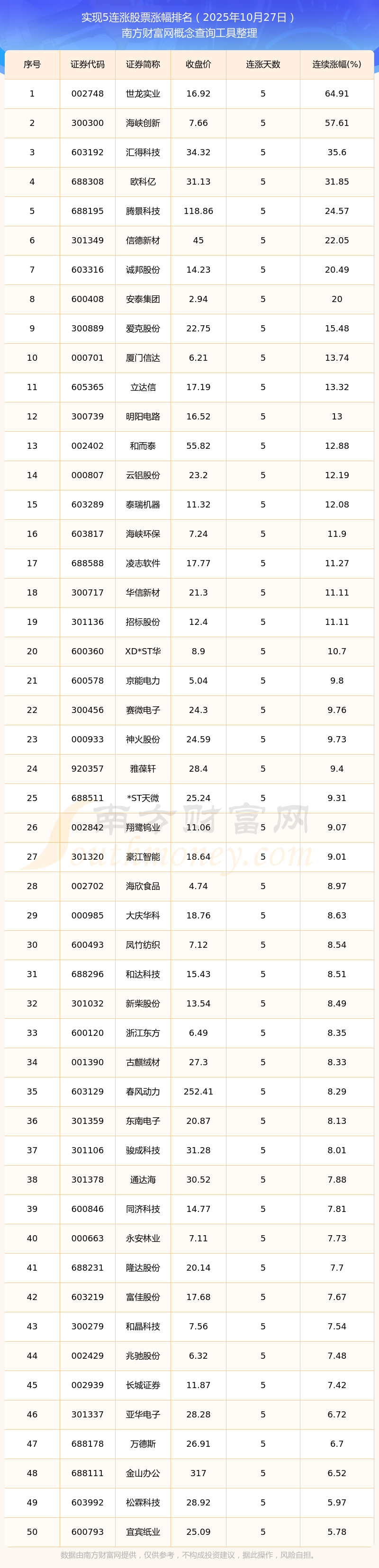 2025年10月27日實現(xiàn)5連漲股票漲幅排名