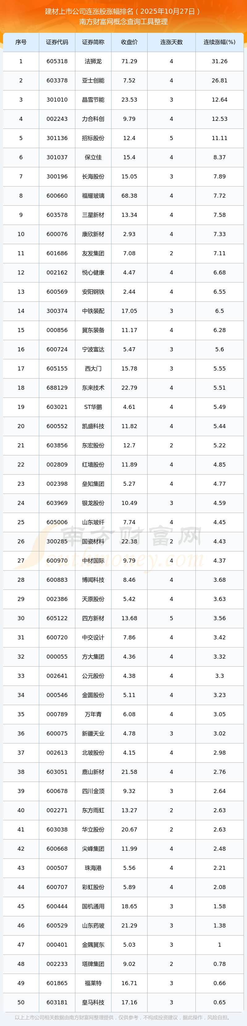 根據(jù)南方財(cái)富網(wǎng)概念查詢(xún)工具數(shù)據(jù)統(tǒng)計(jì),截止2025年10月27日收盤(pán),建材上市公司共有50只個(gè)股實(shí)現(xiàn)連漲。其中連續(xù)漲幅較大的個(gè)股有法獅龍、亞士創(chuàng)能、晶雪節(jié)能等,連續(xù)漲幅分別為31.26%、26.81%、12.64%。