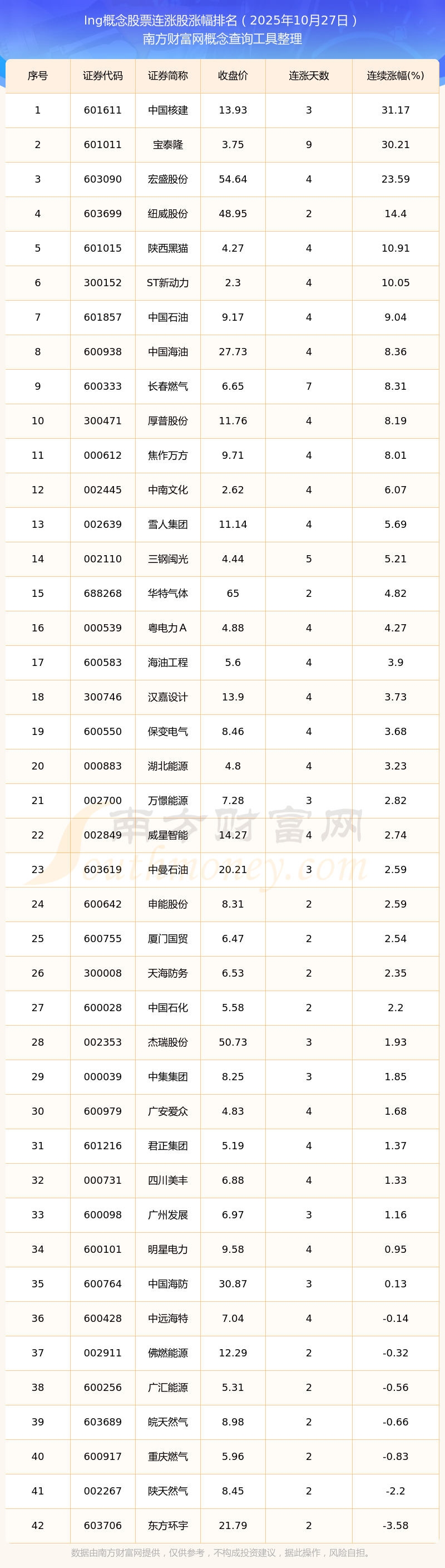 根據(jù)南方財富網(wǎng)概念查詢工具數(shù)據(jù)統(tǒng)計,截止2025年10月27日收盤,lng概念股票共有42只個股實現(xiàn)連漲。其中連續(xù)漲幅較大的個股有中國核建、寶泰隆、宏盛股份等,連續(xù)漲幅分別為31.17%、30.21%、23.59%。