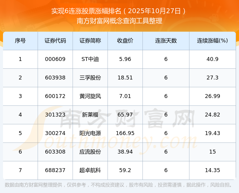 2025年10月27日實(shí)現(xiàn)6連漲股票漲幅排名