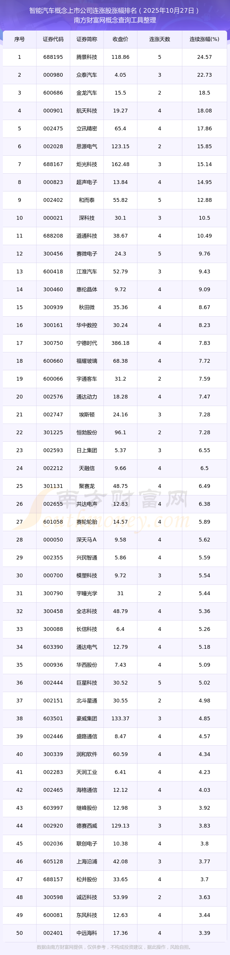 根據(jù)南方財(cái)富網(wǎng)概念查詢工具數(shù)據(jù)統(tǒng)計(jì),截止2025年10月27日收盤,智能汽車概念上市公司共有63只個(gè)股實(shí)現(xiàn)連漲。其中連續(xù)漲幅較大的個(gè)股有騰景科技、眾泰汽車、金龍汽車等,連續(xù)漲幅分別為24.57%、22.73%、18.50%。