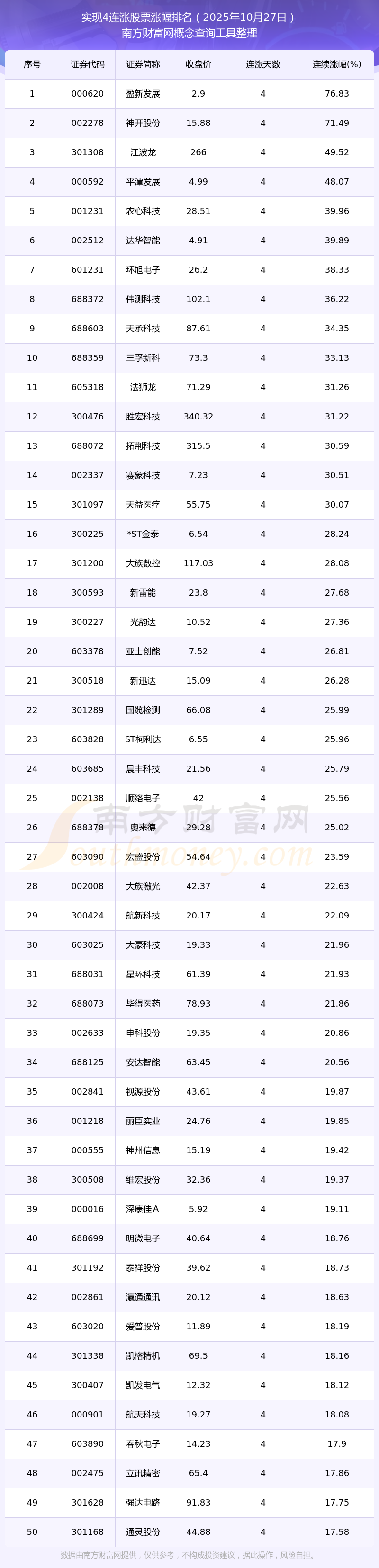2025年10月27日連漲4天的股票漲幅排名