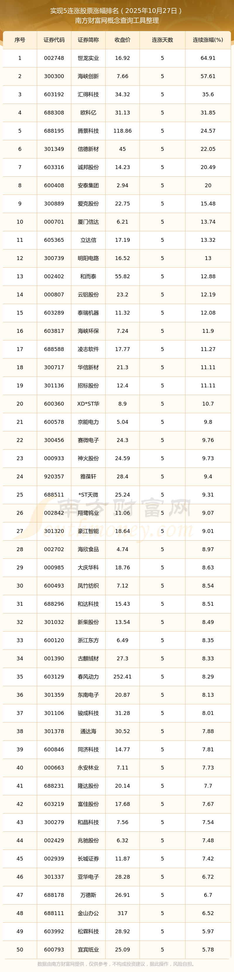 2025年10月27日實(shí)現(xiàn)5連漲股票漲幅排名