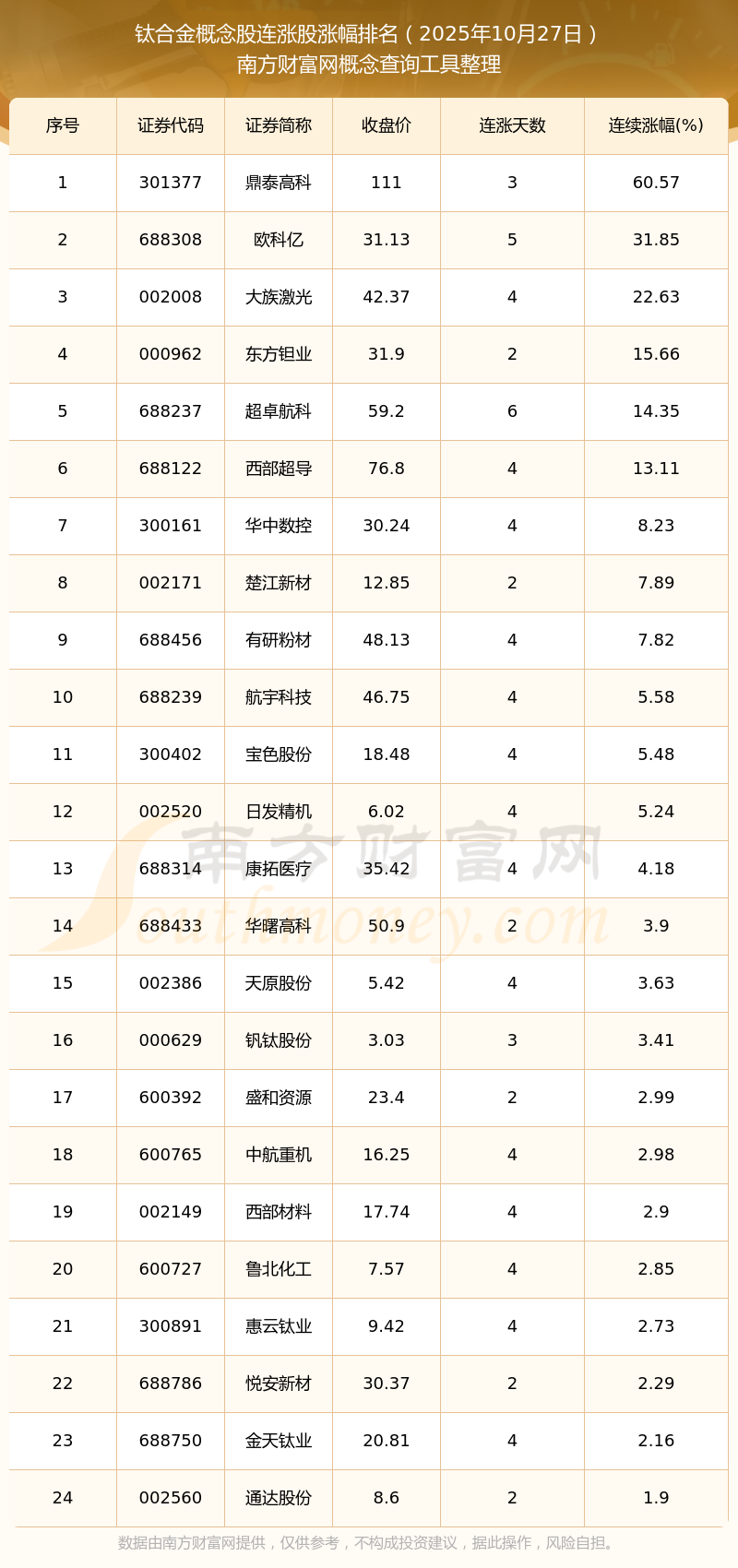 2025年10月27日鈦合金概念股連漲股漲幅排名