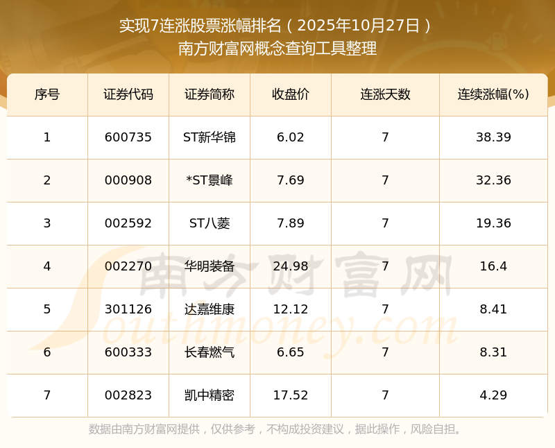 根據(jù)南方財富網(wǎng)概念查詢工具數(shù)據(jù)統(tǒng)計,截止2025年10月27日收盤,共有7只個股實現(xiàn)7天連漲。其中連續(xù)漲幅較大的個股有ST新華錦、*ST景峰、ST八菱等,連續(xù)漲幅分別為38.39%、32.36%、19.36%。