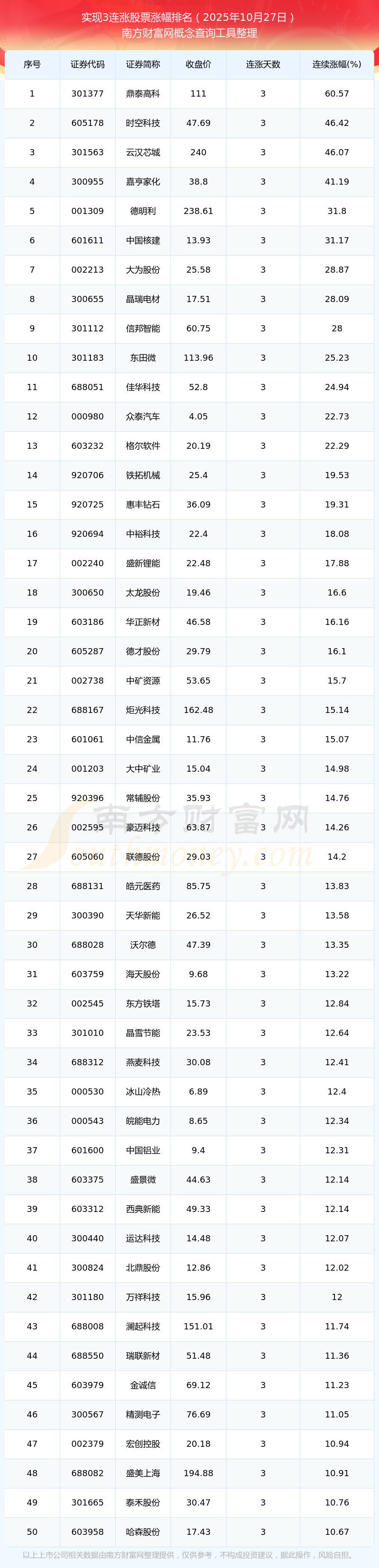 2025年10月27日實(shí)現(xiàn)3連漲股票漲幅排名