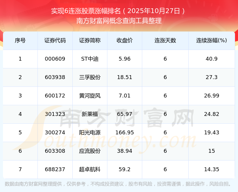 2025年10月27日實現(xiàn)6連漲股票漲幅排名