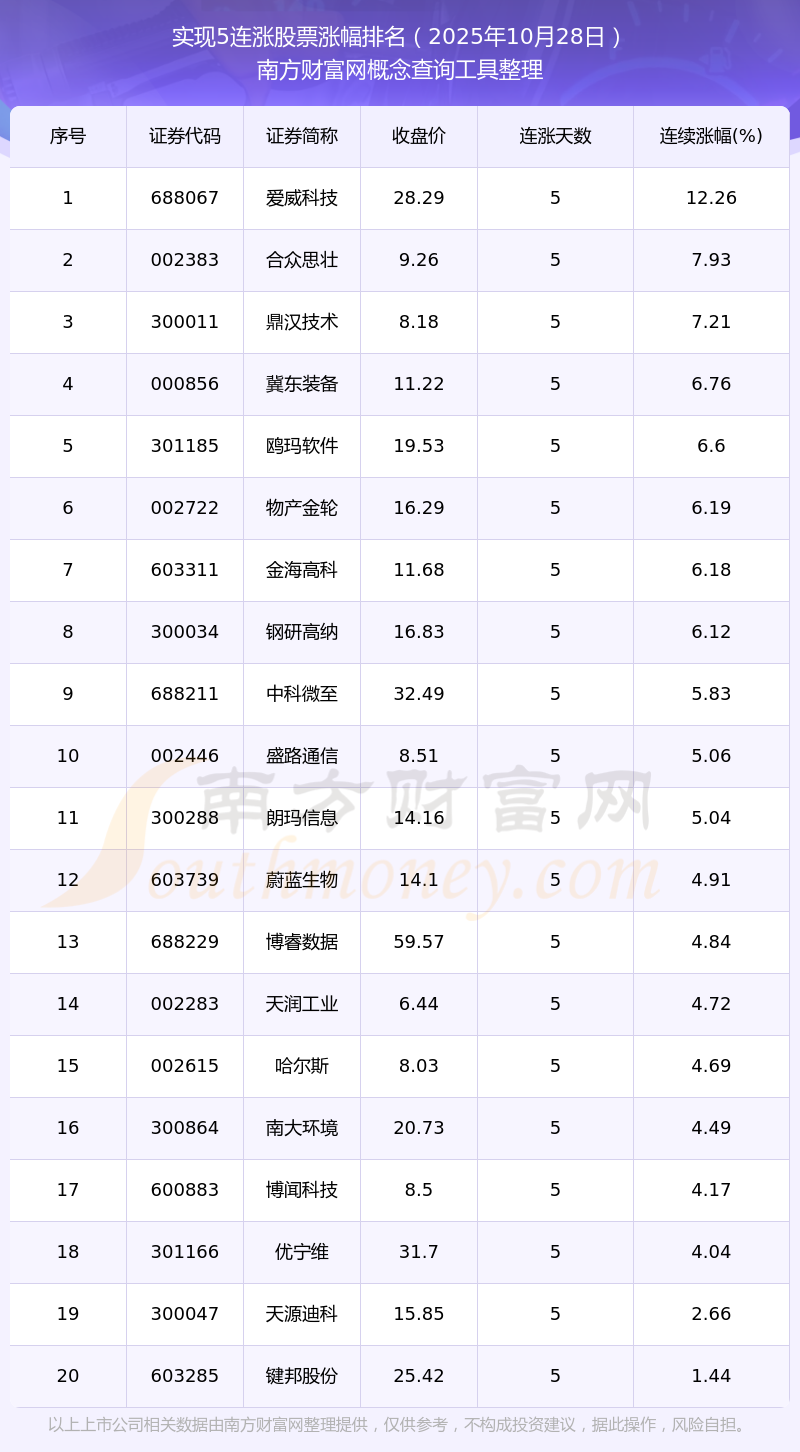 根據(jù)南方財(cái)富網(wǎng)概念查詢工具數(shù)據(jù)統(tǒng)計(jì),截止2025年10月28日收盤,共有20只個(gè)股實(shí)現(xiàn)5天連漲。其中連續(xù)漲幅較大的個(gè)股有愛威科技、合眾思?jí)、鼎漢技術(shù)等,連續(xù)漲幅分別為12.26%、7.93%、7.21%。