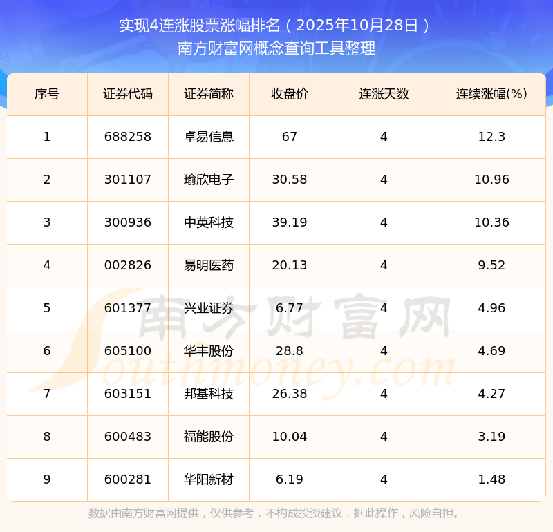 根據(jù)南方財(cái)富網(wǎng)概念查詢工具數(shù)據(jù)統(tǒng)計(jì),截止2025年10月28日收盤,共有9只個(gè)股實(shí)現(xiàn)4天連漲。其中連續(xù)漲幅較大的個(gè)股有卓易信息、瑜欣電子、中英科技等,連續(xù)漲幅分別為12.30%、10.96%、10.36%。