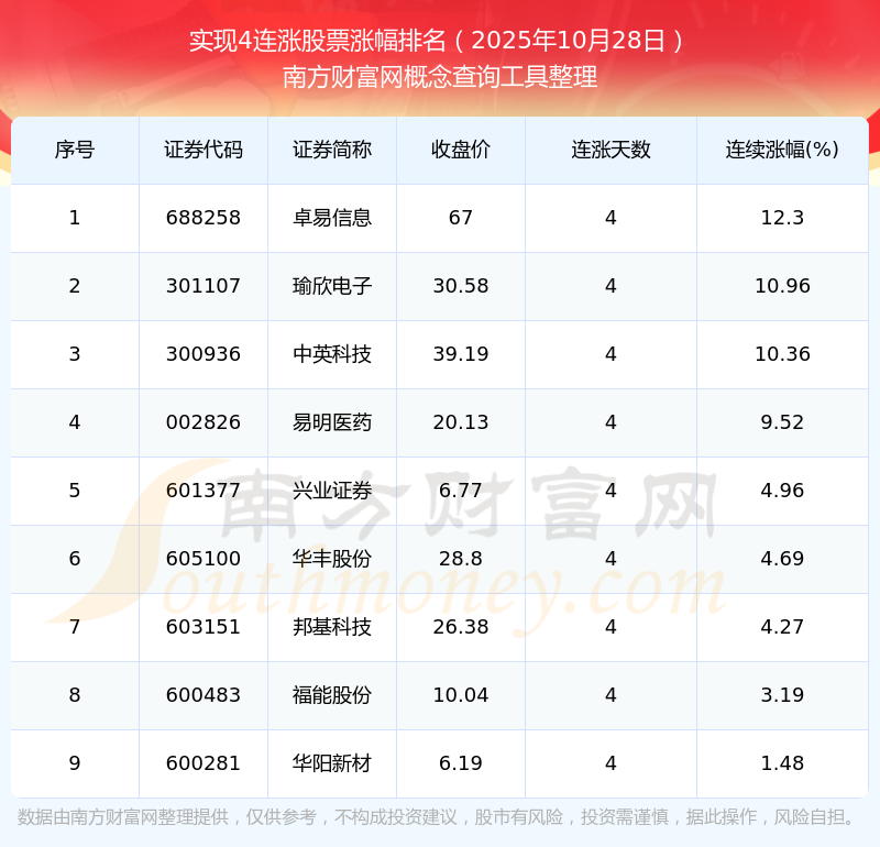 2025年10月28日實(shí)現(xiàn)4連漲股票漲幅排名