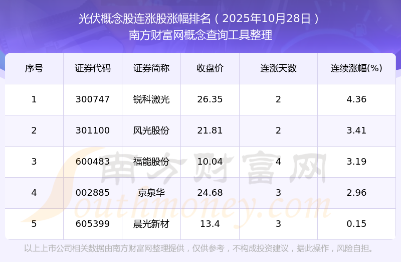 根據(jù)南方財富網(wǎng)概念查詢工具數(shù)據(jù)統(tǒng)計,截止2025年10月28日收盤,光伏概念股共有5只個股實現(xiàn)連漲。其中連續(xù)漲幅較大的個股有銳科激光、風光股份、福能股份等,連續(xù)漲幅分別為4.36%、3.41%、3.19%。