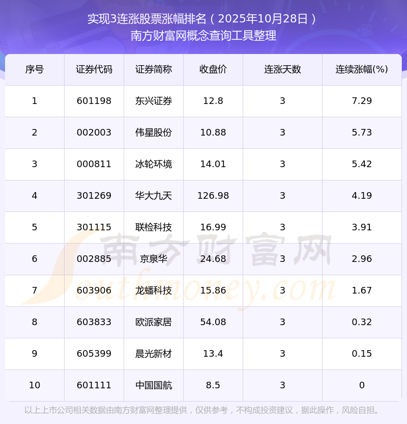 根據(jù)南方財富網(wǎng)概念查詢工具數(shù)據(jù)統(tǒng)計,截止2025年10月28日收盤,共有10只個股實現(xiàn)3天連漲。其中連續(xù)漲幅較大的個股有東興證券、偉星股份、冰輪環(huán)境等,連續(xù)漲幅分別為7.29%、5.73%、5.42%。