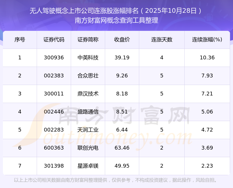 2025年10月28日無人駕駛概念上市公司連漲股漲幅排名