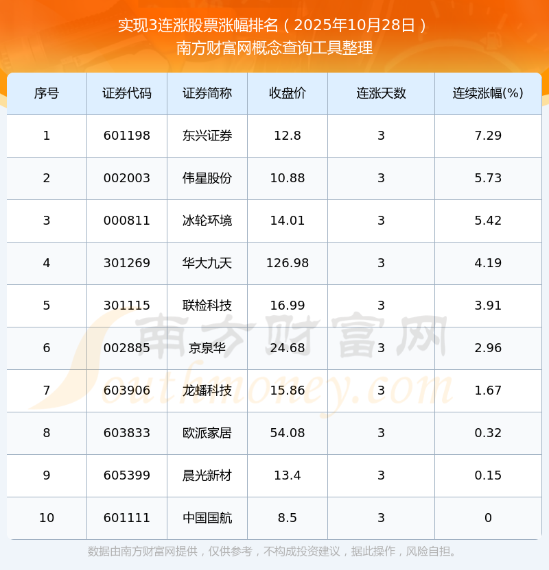 根據南方財富網概念查詢工具數據統計,截止2025年10月28日收盤,共有10只個股實現3天連漲。其中連續(xù)漲幅較大的個股有東興證券、偉星股份、冰輪環(huán)境等,連續(xù)漲幅分別為7.29%、5.73%、5.42%。