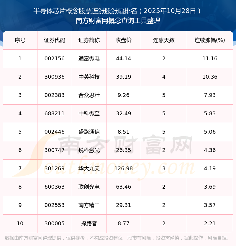 2025年10月28日半導(dǎo)體芯片概念股票連漲股漲幅排名