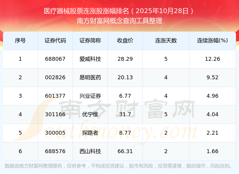 根據(jù)南方財富網(wǎng)概念查詢工具數(shù)據(jù)統(tǒng)計,截止2025年10月28日收盤,醫(yī)療器械股票共有6只個股實現(xiàn)連漲。其中連續(xù)漲幅較大的個股有愛威科技、易明醫(yī)藥、興業(yè)證券等,連續(xù)漲幅分別為12.26%、9.52%、4.96%。