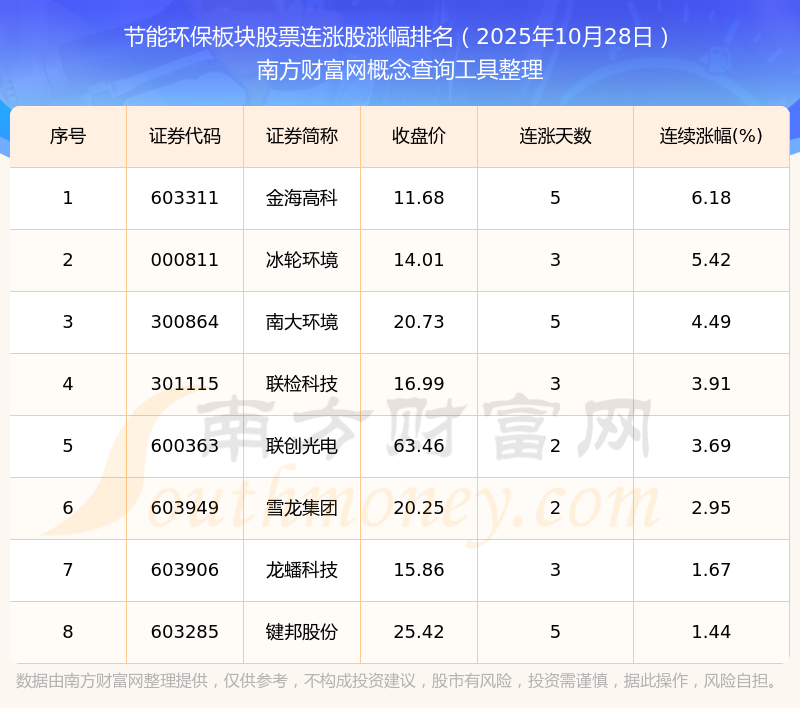 2025年10月28日節(jié)能環(huán)保板塊股票連漲股漲幅排名