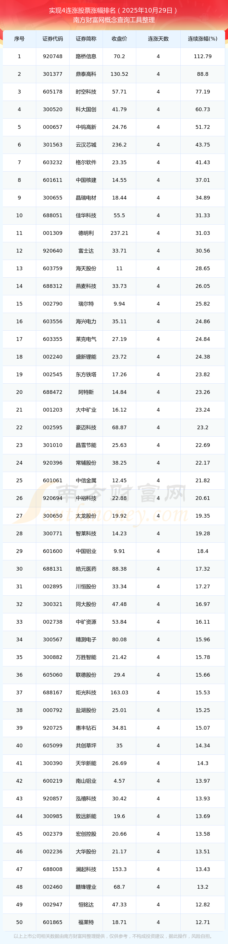 2025年10月29日實現(xiàn)4連漲股票漲幅排名