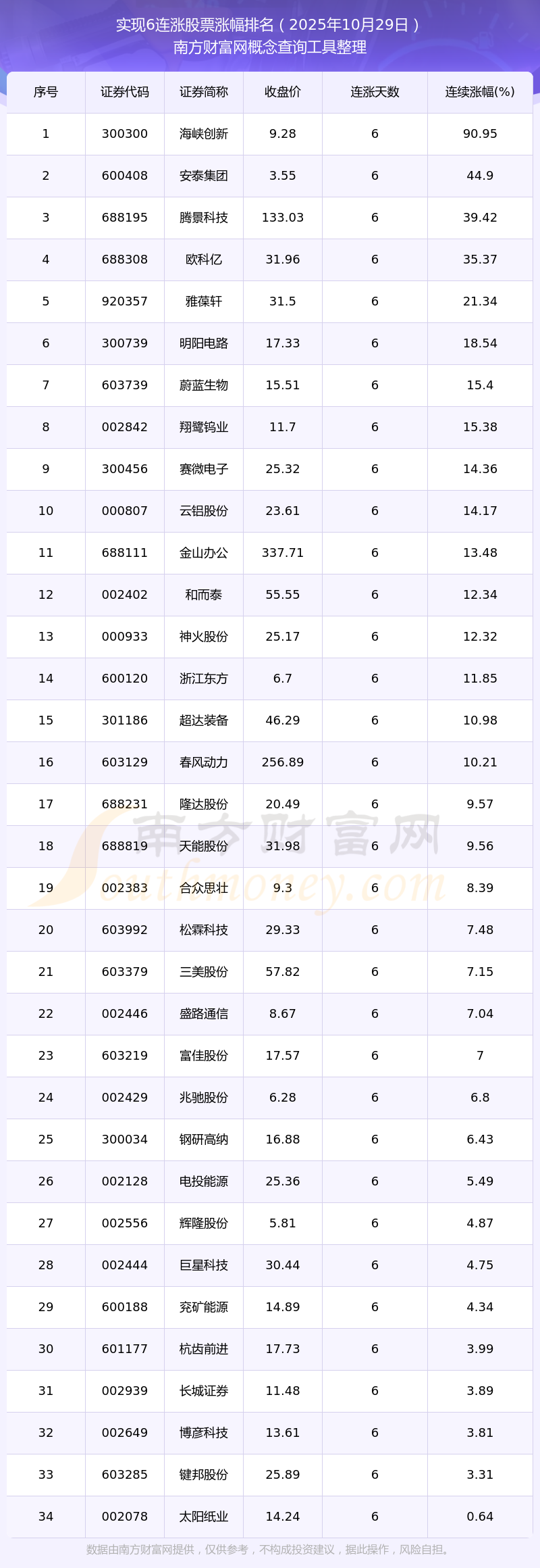 2025年10月29日實(shí)現(xiàn)6連漲股票漲幅排名