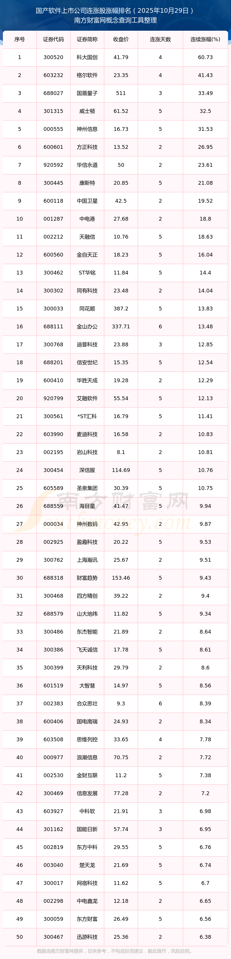2025年10月29日國(guó)產(chǎn)軟件上市公司連漲股漲幅排名