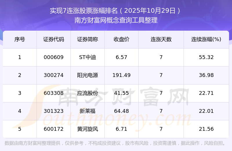 根據(jù)南方財(cái)富網(wǎng)概念查詢工具數(shù)據(jù)統(tǒng)計(jì),截止2025年10月29日收盤,共有5只個(gè)股實(shí)現(xiàn)7天連漲。其中連續(xù)漲幅較大的個(gè)股有ST中迪、陽(yáng)光電源、應(yīng)流股份等,連續(xù)漲幅分別為55.32%、36.98%、22.71%。