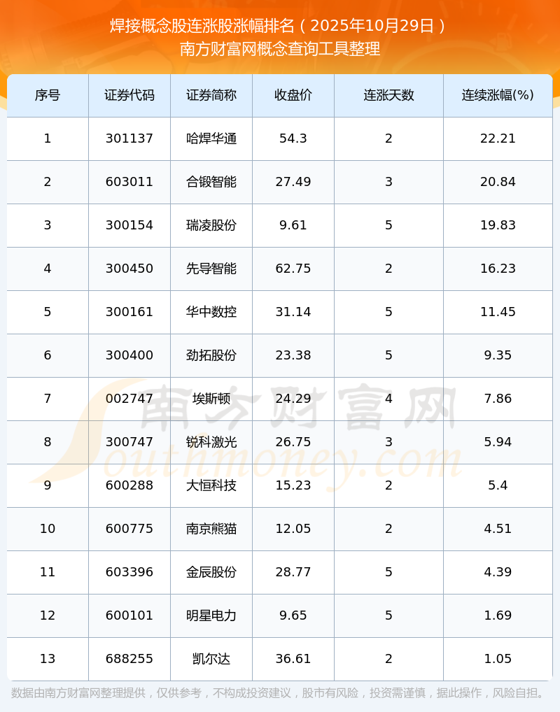 2025年10月29日焊接概念股連漲股漲幅排名