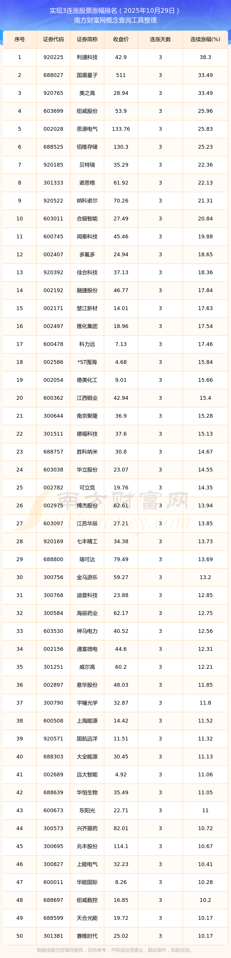 2025年10月29日實現(xiàn)3連漲股票漲幅排名