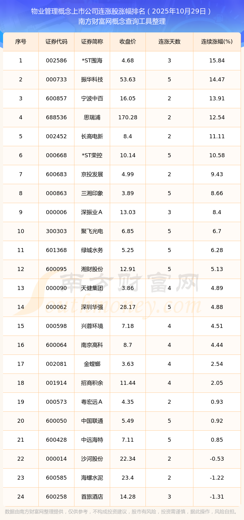 2025年10月29日物業(yè)管理概念上市公司連漲股票漲幅排名