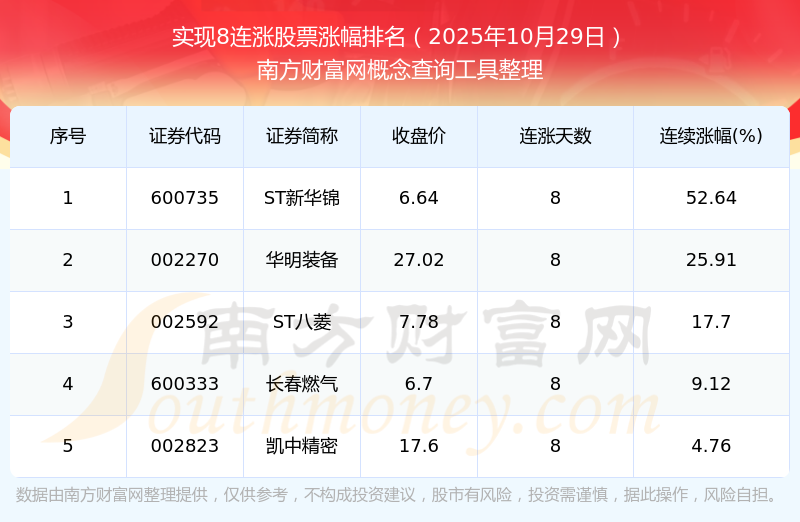 根據(jù)南方財(cái)富網(wǎng)概念查詢工具數(shù)據(jù)統(tǒng)計(jì),截止2025年10月29日收盤,共有5只個(gè)股實(shí)現(xiàn)8天連漲。其中連續(xù)漲幅較大的個(gè)股有ST新華錦、華明裝備、ST八菱等,連續(xù)漲幅分別為52.64%、25.91%、17.70%。