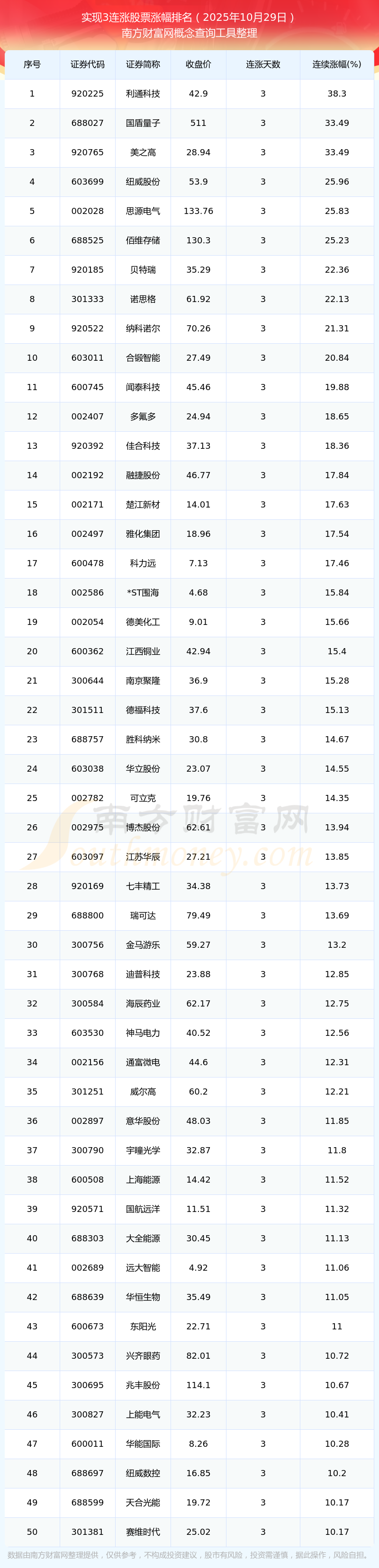 2025年10月29日實現(xiàn)3連漲股票漲幅排名
