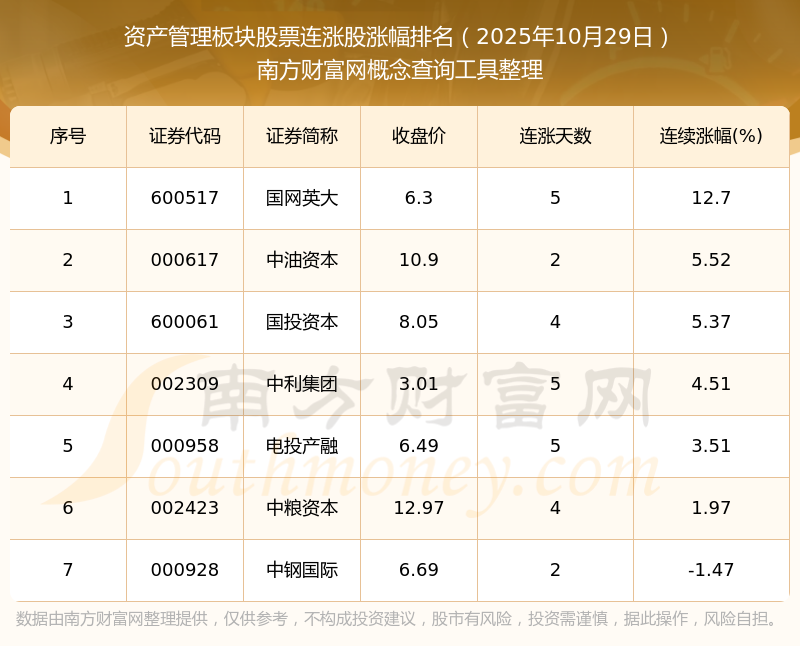 2025年10月29日資產管理板塊股票連漲股漲幅排名
