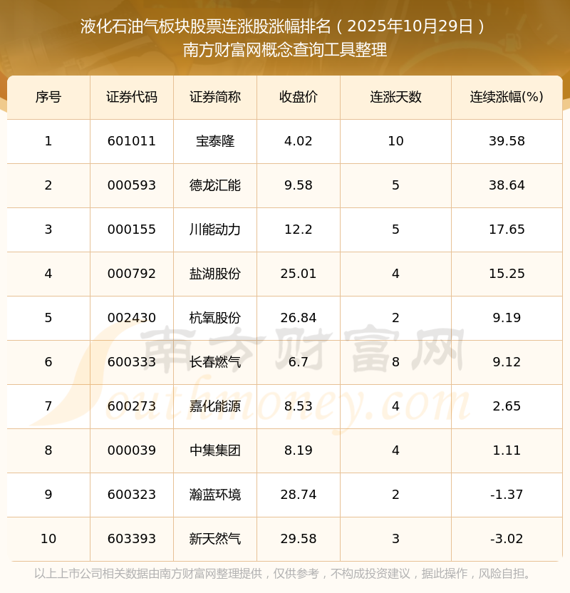 2025年10月29日液化石油氣板塊股票連漲股漲幅排名