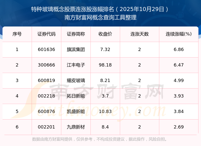 2025年10月29日特種玻璃概念股票連漲股漲幅排名