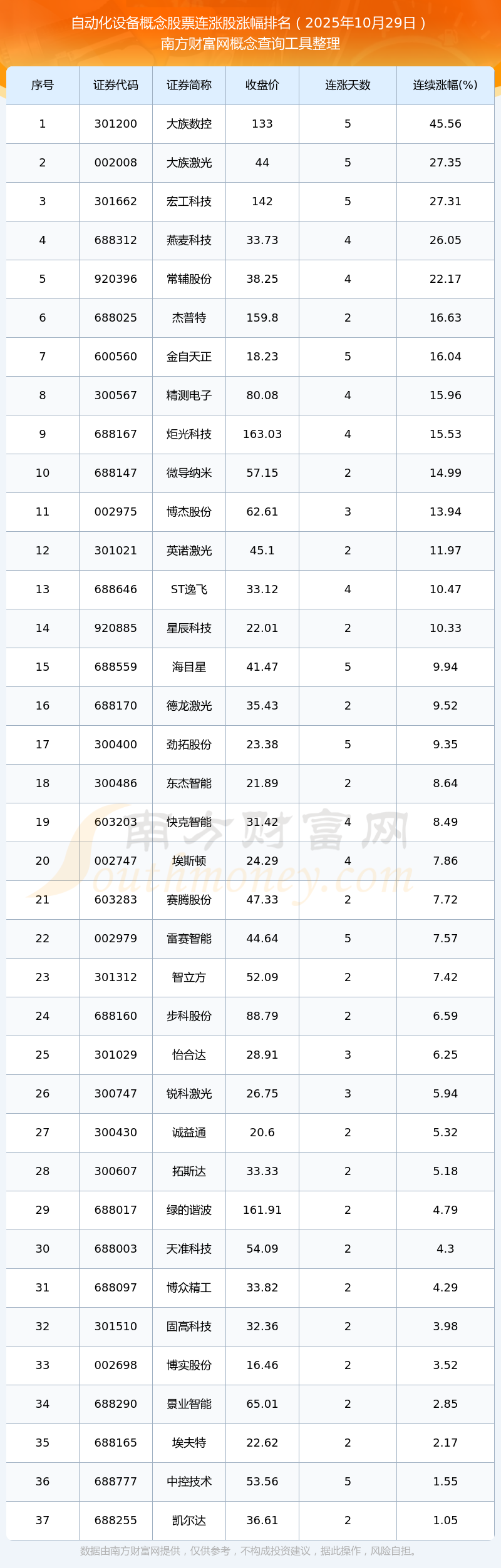 2025年10月29日自動化設(shè)備概念股票連漲股漲幅排名