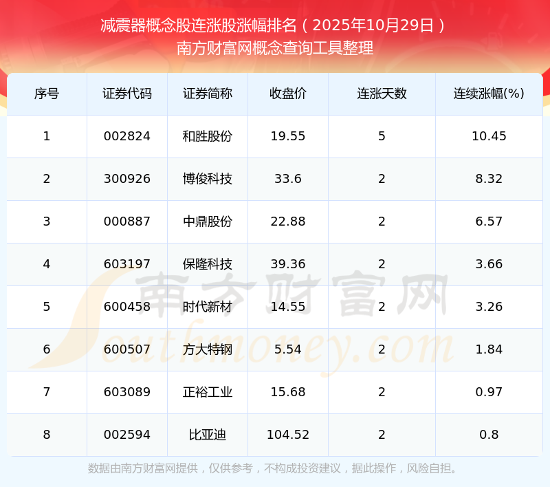 根據南方財富網概念查詢工具數據統(tǒng)計,截止2025年10月29日收盤,減震器概念股共有8只個股實現連漲。其中連續(xù)漲幅較大的個股有和勝股份、博俊科技、中鼎股份等,連續(xù)漲幅分別為10.45%、8.32%、6.57%。