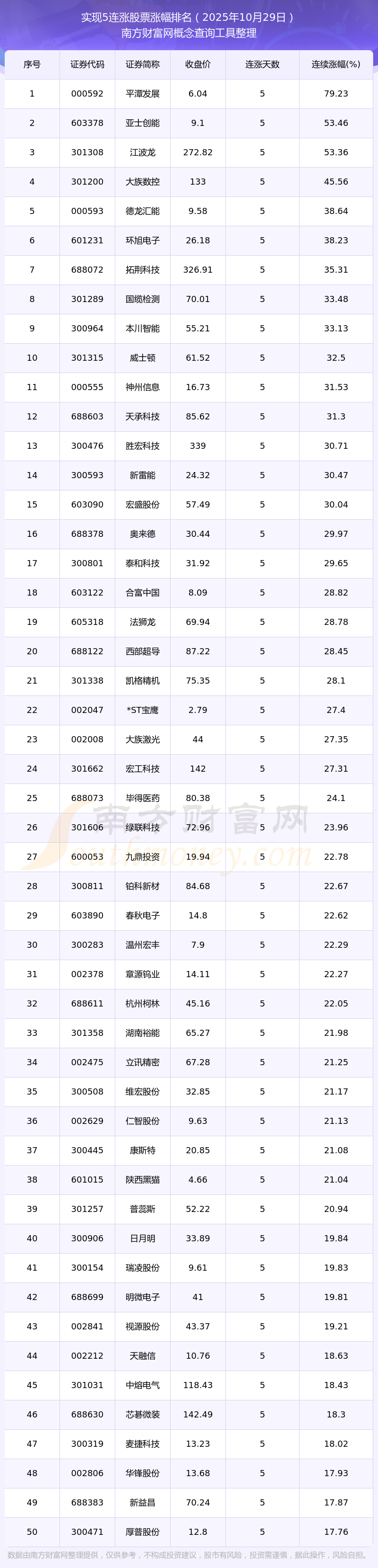根據(jù)南方財(cái)富網(wǎng)概念查詢工具數(shù)據(jù)統(tǒng)計(jì),截止2025年10月29日收盤,共有422只個(gè)股實(shí)現(xiàn)5天連漲。其中連續(xù)漲幅較大的個(gè)股有平潭發(fā)展、亞士創(chuàng)能、江波龍等,連續(xù)漲幅分別為79.23%、53.46%、53.36%。