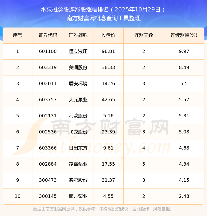 根據(jù)南方財(cái)富網(wǎng)概念查詢工具數(shù)據(jù)統(tǒng)計(jì),截止2025年10月29日收盤(pán),水泵概念股共有10只個(gè)股實(shí)現(xiàn)連漲。其中連續(xù)漲幅較大的個(gè)股有恒立液壓、美湖股份、盾安環(huán)境等,連續(xù)漲幅分別為9.97%、8.49%、6.50%。